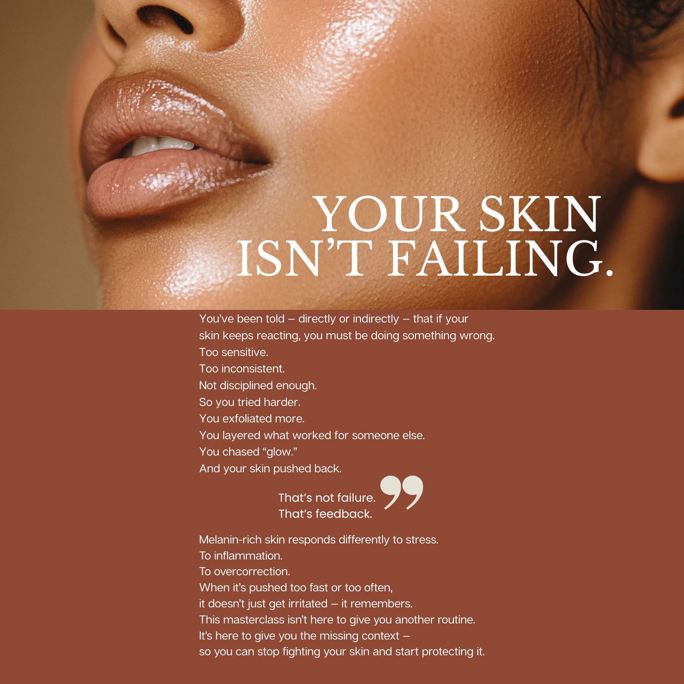 The Melanin Masterclass: Skin Reset is a corrective guide for melanin-rich skin that’s inflamed, overworked, or stuck in cycles of irritation and hyperpigmentation.